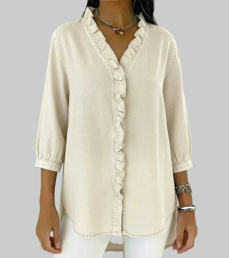 Elegant, vielseitig und unbestreitbar feminin, die Abigail™ Elegante Denim-Bluse interpretiert Denim in einer weichen, figurschmeichelnden Silhouette neu. Der geraffte V-Ausschnitt verlängert die Halslinie, während der fließende Schnitt den ganzen Tag über Komfort bietet und sie perfekt für mühelose schicke Stylings von lässig bis raffiniert macht.